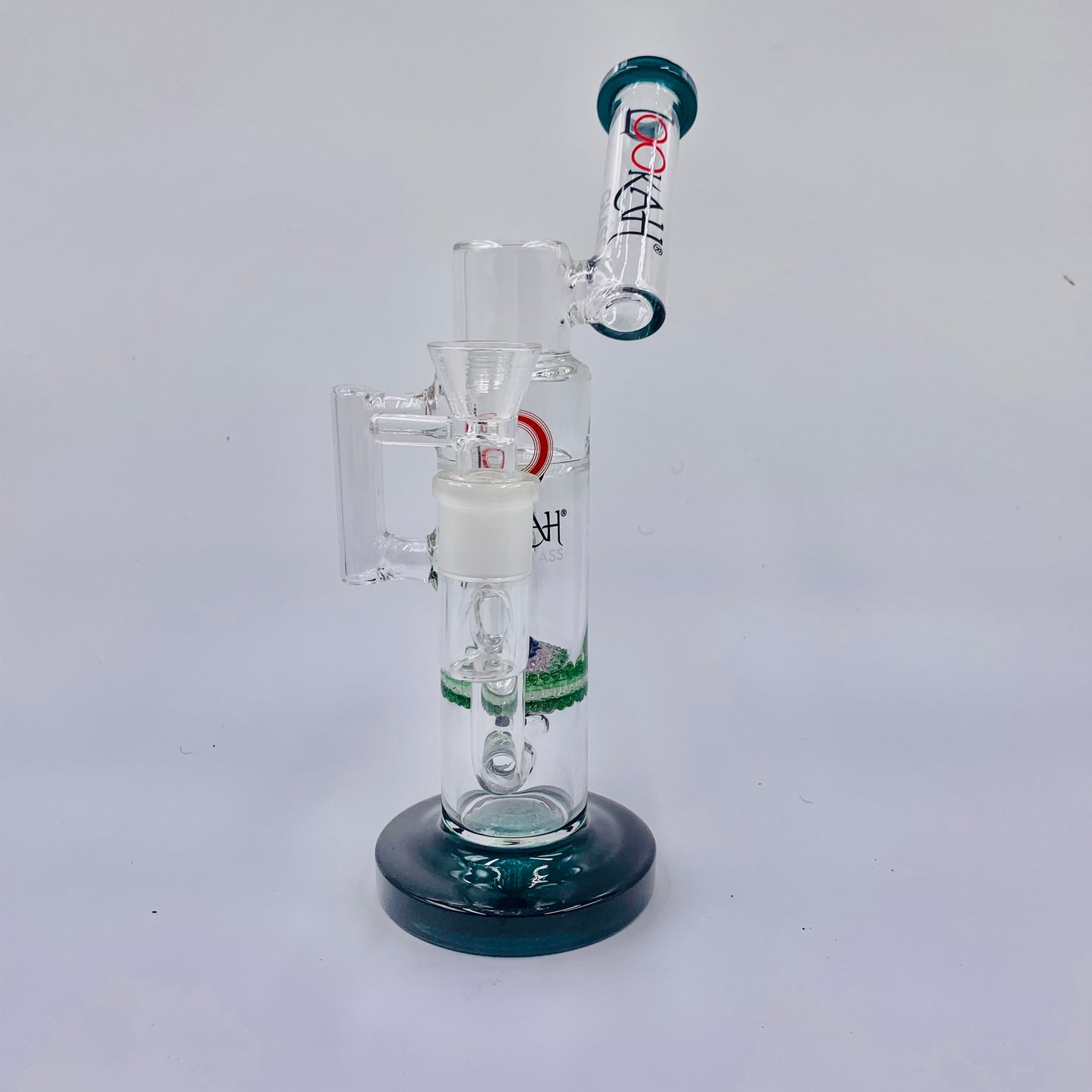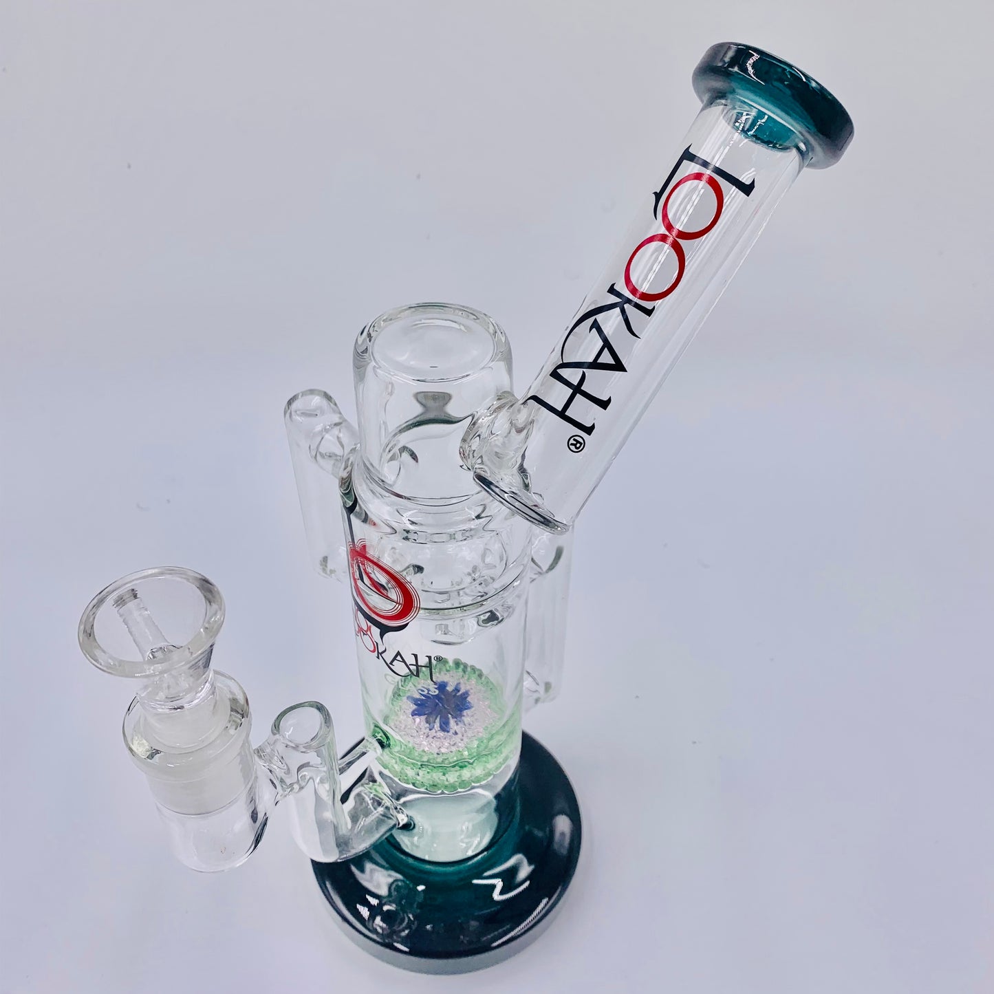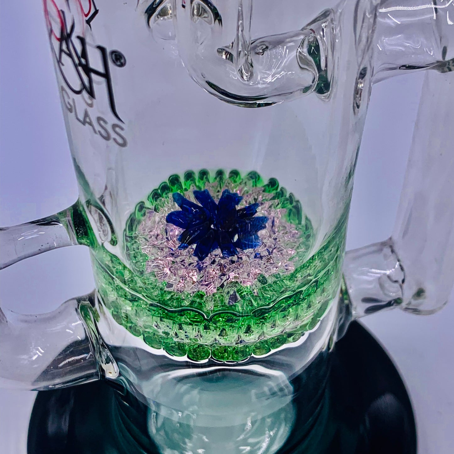 DOUBLE CHAMBER, BEADWORK PERC, AND DUAL RECYCLERS. 18MM FEMALE JOINT AND 18 MALE BOWL PIECE.